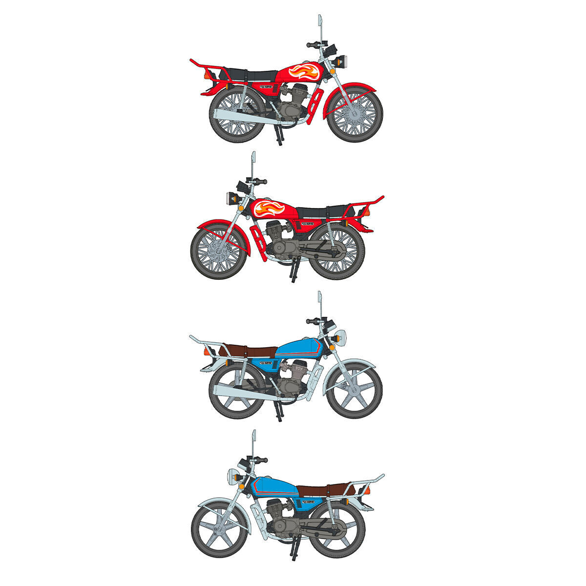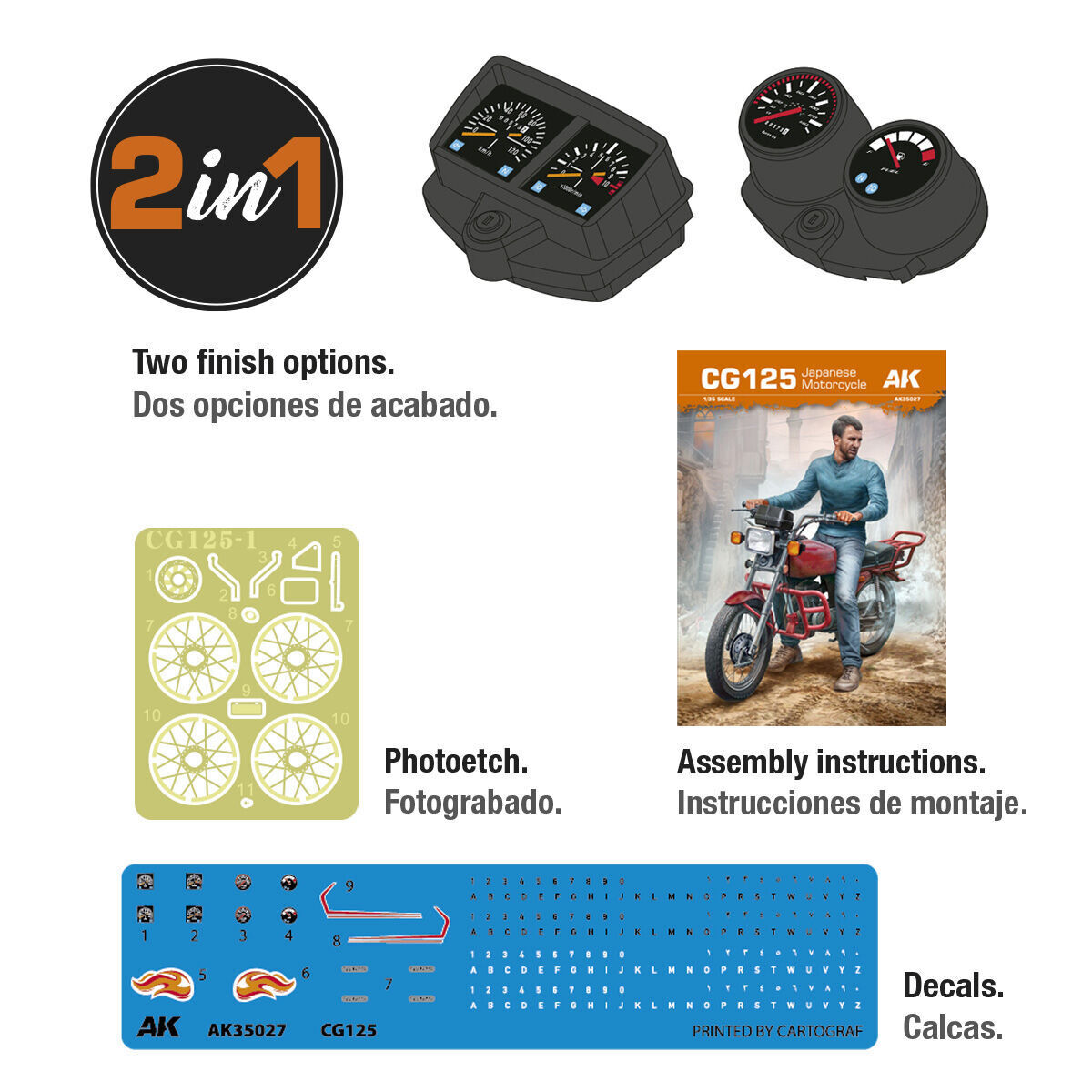• Allows for building a model of one of two versions of CG125 with different instrument clusters, headlights and wheel rims.
