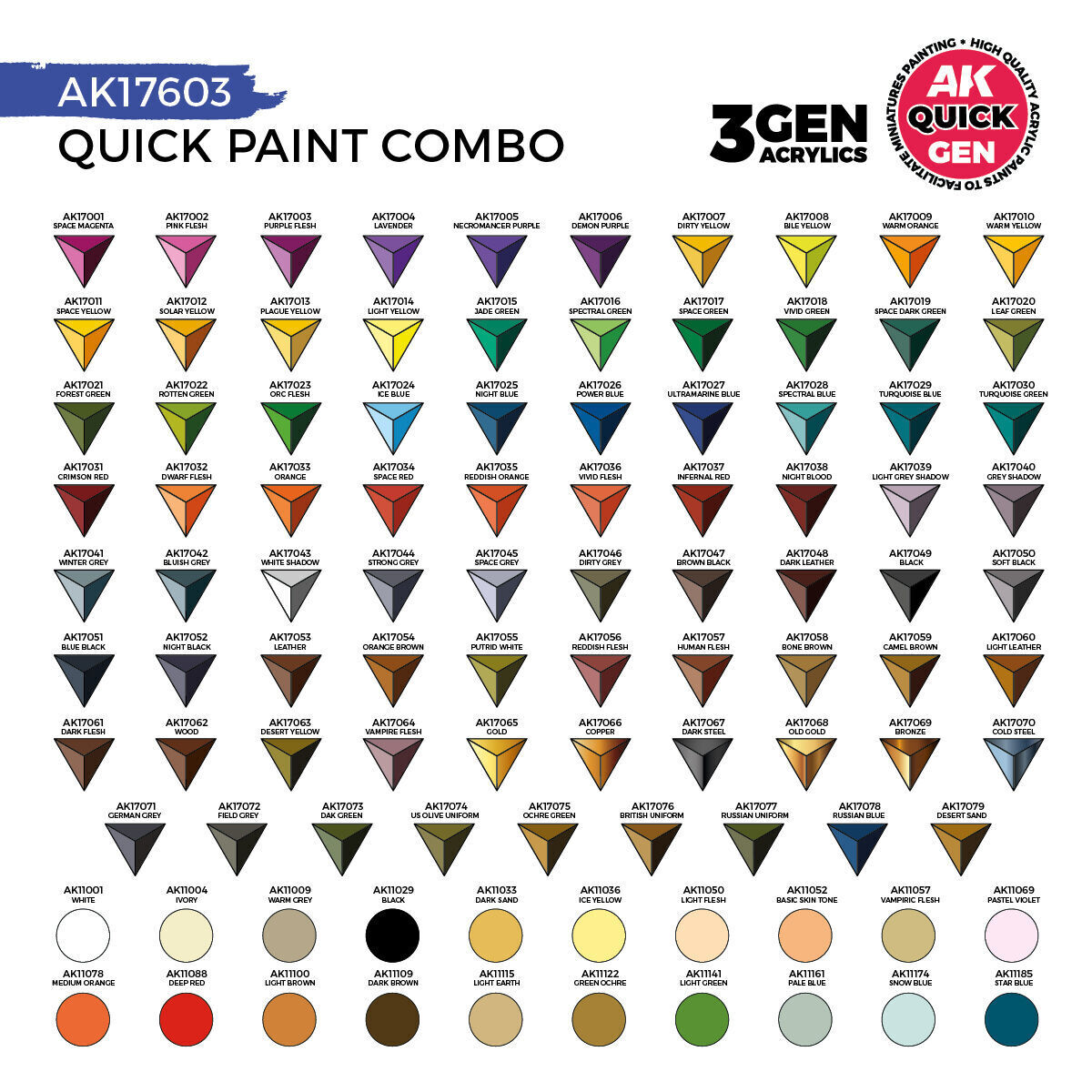 Inside you’ll find 80x18ml QUICK GEN paints, 20x18ml 3GEN paints, 1 Medium (AK17080) and 3 Brushes for FREE.