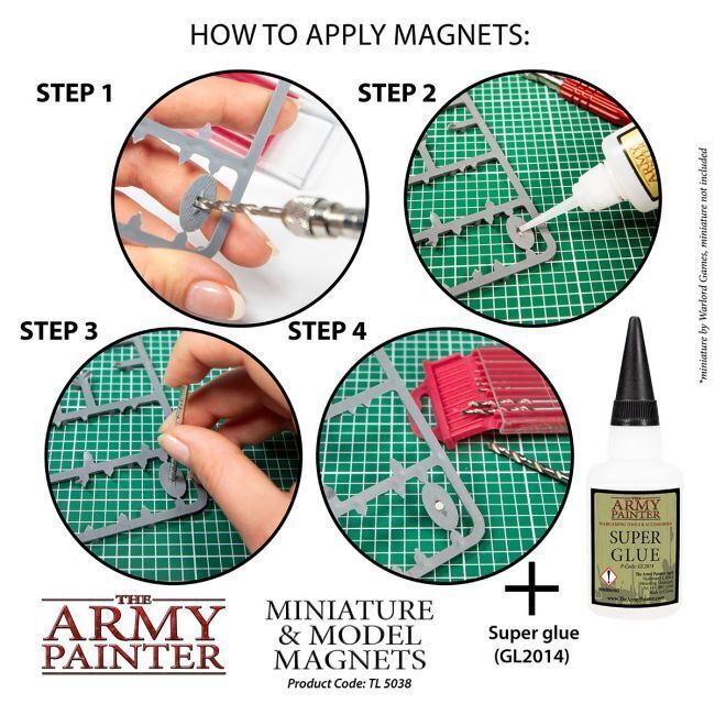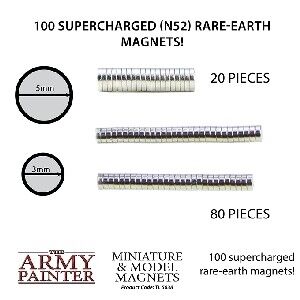 These supercharged rare-earth magnets are very high grade & strength (N52), enabling you to do complex conversions or simply magnetise different weapons to your models. These super strong rare earth magnets are perfect for making changeable weapons, moveable turrets or a multiple of other uses. The pack contains 80 3mm diameter and 20 5mm diameter magnets.