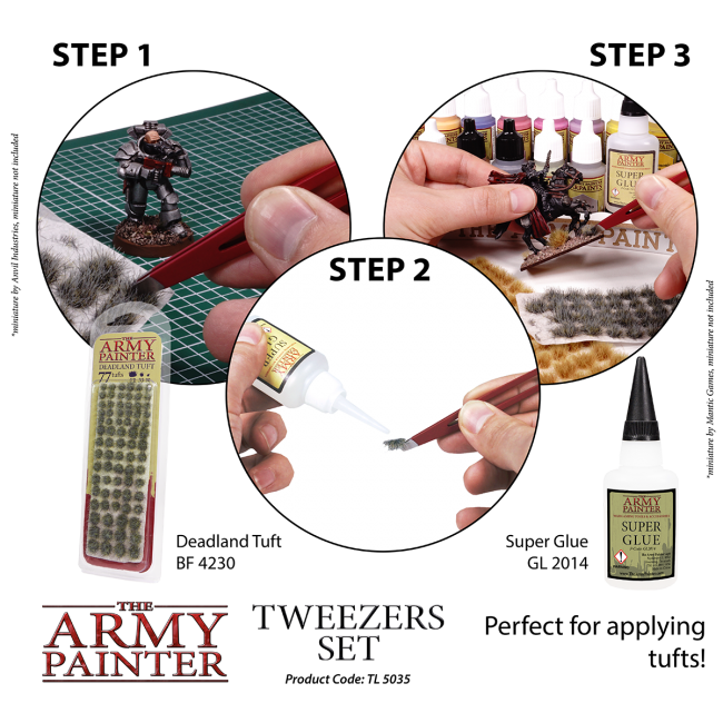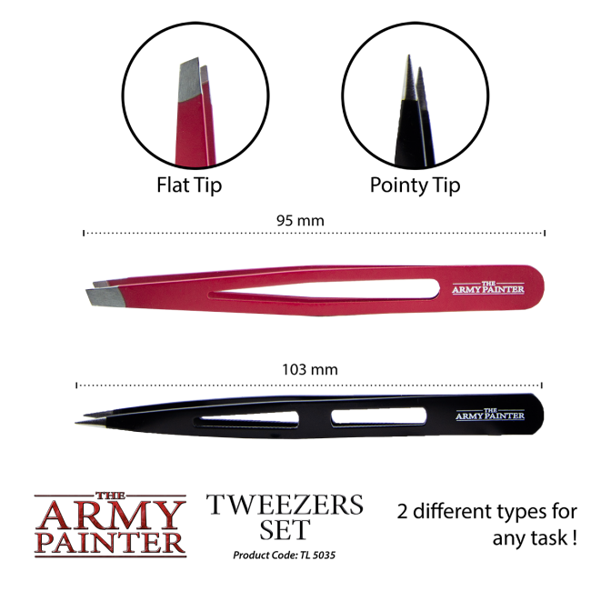 These metal tweezers are a very useful tool for assembling miniatures and handling small components, especially for gluing, converting or handling decals. Glue with perfect precision and control. The pack contains two different tweezers, one with a fine pointed end and the other with an oblique end for firm control.