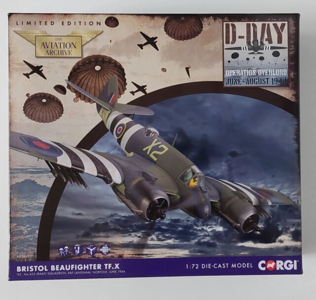 This model of a Beaufighter TF.X is in the classic Coastal Command camouflage scheme with invasion stripes.