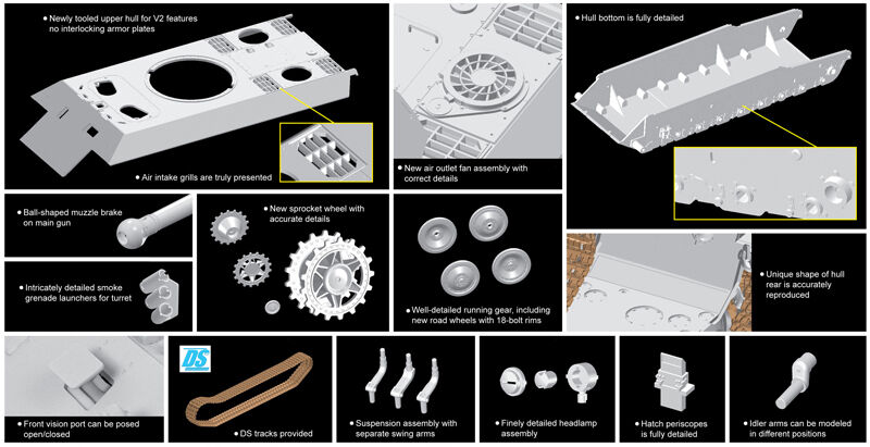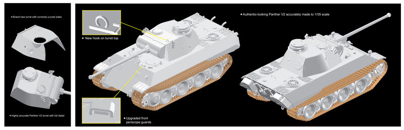 Dragon is proud to launch its first 1/35 scale kit of the prototypical Panther V2 created by MAN in the autumn of 1942. The kit is logically based on Dragon...s existing Panther family kits, but there are many new parts incorporated into it to reflect the characteristics of this early prototype. These differences include the turret (with curved sides), upper hull, engine deck and road wheels (with 18 rim bolts instead of the later 16). Another example of its differences was that there were no interlocking armor plates on the hull. This Versuchs-Serie FgSt.Nr.2. tank has been intricately replicated in 1/35 scale, drawing upon Dragon...s technical and technological expertise. This Panther V2 kit is thus a welcome addition to the lineage of the Panther family.