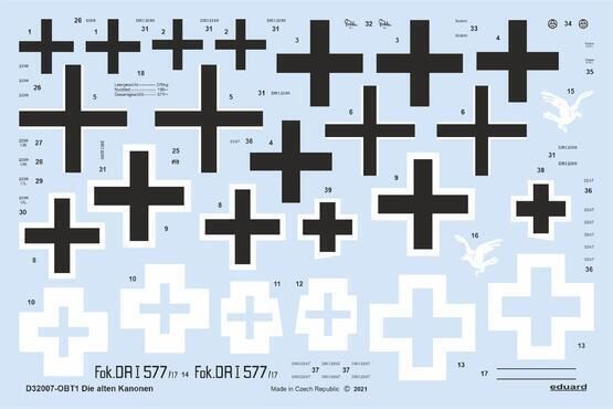 Eduard decal set detailing "Die Alten Kanonen" livery on various Fokker Dr.I planes flown by the various pilots.
