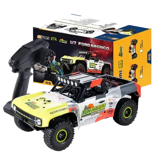 The FMS 1/7 Ford Bronco RTR EB is built with the same performance-first design as the full-scale Ultra4 race truck. It features true front independent suspension and a solid rear axle, all mounted to a rugged CNC-machined metal chassis. With eight aluminum oil-filled shocks, a high-torque steering servo, grippy licensed Nitto tires, and a premium brushless power system, it delivers sharp handling, serious traction, and high-impact fun—whether you're bouncing through rocky trails, blasting across sand, or launching over jumps.