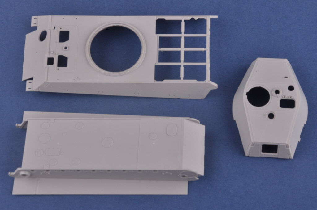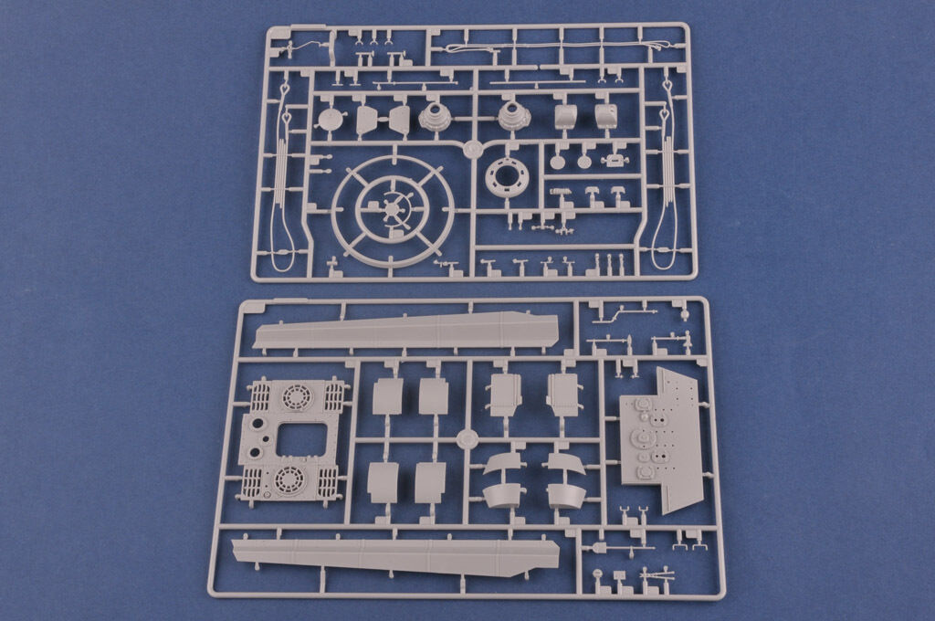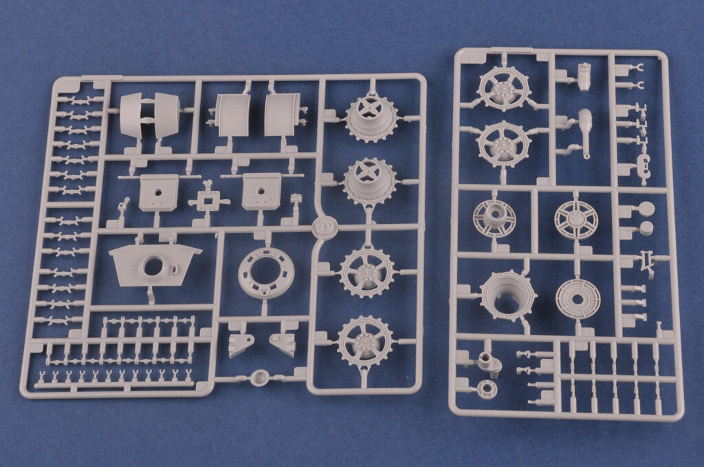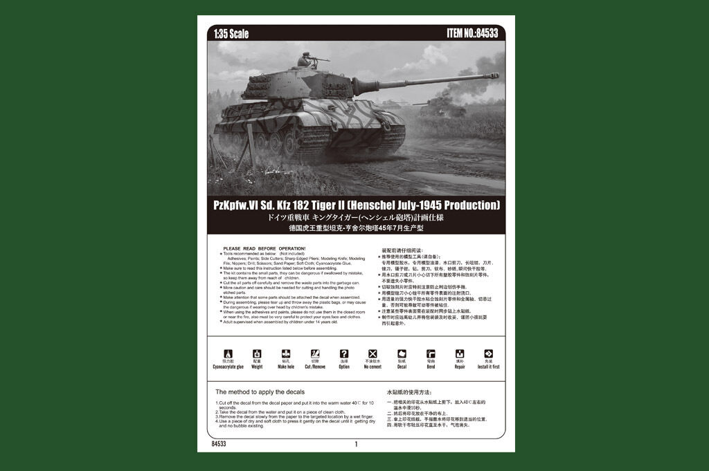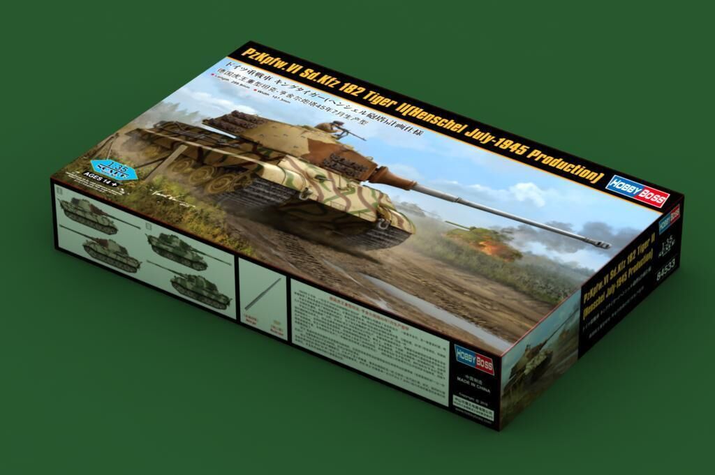 In early October 1942, plans for production of the VK 45. 03 were reviewed Initially two designs were provided, one by Henschel and one by Porsche. Both used a turret design from Krupp; the main differences were in the hull design, transmission and suspension. The Henschel version used a conventional hull design with sloped armor resembling the layout of the Panther tank. It had a rear mounted engine and used nine overlapping road wheels per side, mounted on transverse torsion bars, in a similar manner to the original Tiger. To simplify maintenance, however, the wheels were overlapping rather than interleaved as in the Tiger Henschel won the contract, and all Tiger IIs were produced by the firm. Two turret designs were used in production vehicles. The initial design is sometimes misleadingly called the Porsche turret" due to the belief that it was designed by Porsche for their prototype. In fact this turret was simply the initial Krupp design for both prototypes. This turret had a rounded front and steeply sloped sides, with a difficult-to-manufacture curved bulge on the turret's left side, to accommodate the commander's cupola. Fifty early turrets were mounted to Henschel's hull and used in action. The more common "production" turret, sometimes called the "Henschel" turret, was simplified with a flat face, no shot trap (created by the curved face of the initial-type turret), less-steeply sloped sides, and no bulge for the commander's cupola. The track system used on the Tiger II chassis was a unique one, which used alternating "contact shoe" and "connector" linksxthe contact shoe link had a pair of transverse metal bars that contacted the ground, while the connector links had no contact with the ground. The Tiger II was developed late in the war and made in relatively small numbers. Like all German tanks, it had a gasoline engine. However, this same engine powered the much lighter Panther and Tiger I tanks. The Tiger II was under-powered, like many other heavy tanks of World War II, and consumed a lot of fuel which was already in short supply."
