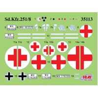 The platoons, companies, and battalions of the Wehrmacht included combat doctors who provided direct medical assistance to the wounded. Infantry companies also had individual non-commissioned officers of the medical service, and at the battalion level, a military doctor (Assistenzarzt or Oberarzt) was responsible for centralized medical care. Wehrmacht combat doctors were also responsible for evacuating the wounded to first aid points or collection points. Armored transporters could be used for evacuation, one of which was a special medical armored personnel carrier designated as the Sd.Kfz.251/8 or ‘Krankenpanzerwagen.’ This armored personnel carrier could carry various numbers of wounded, for which it had special stretchers and seats inside. Additionally, semicircular rails were installed on top of the hull for an awning to protect from the weather. Armored medical transporters were part of the headquarters company (Stabskompanie). For visual differentiation from standard vehicles, these transporters had large signs with a red medical cross.