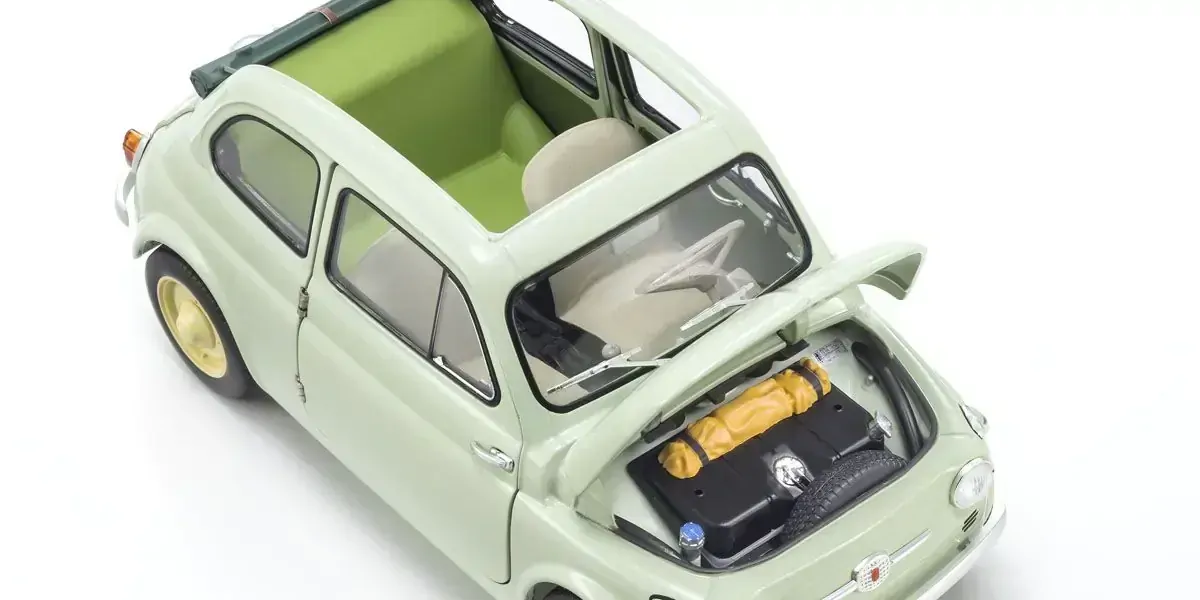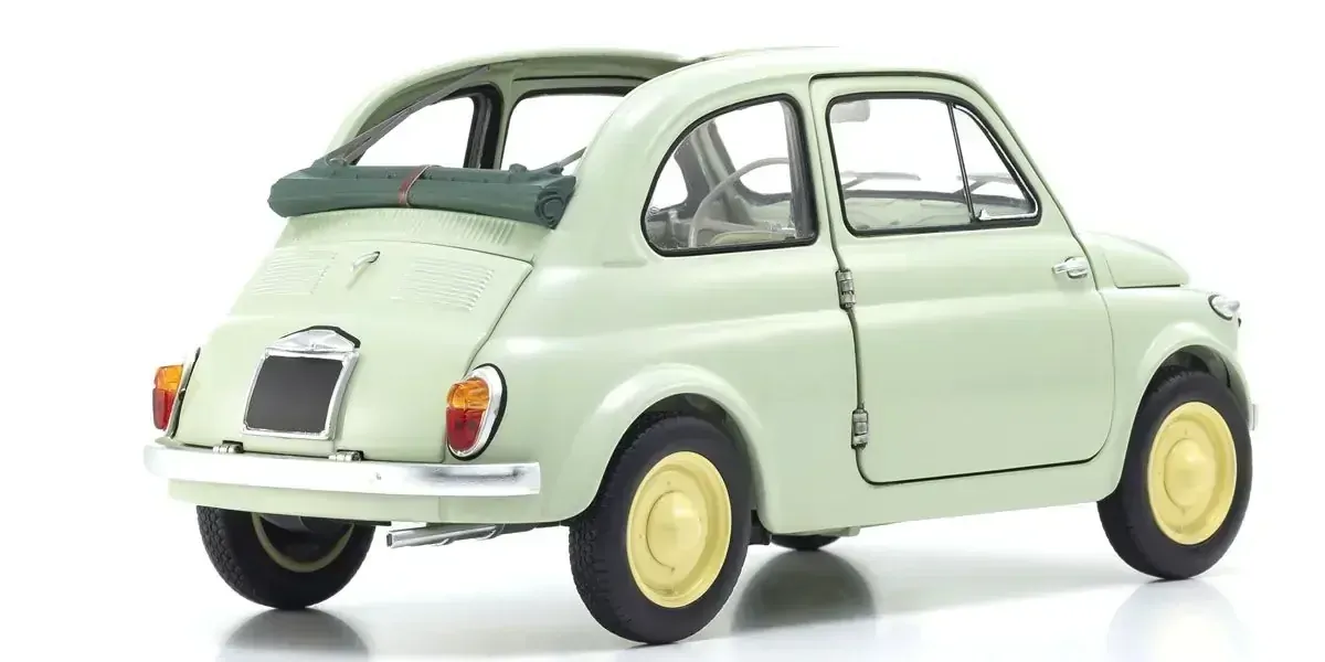 From 1957 to 1975 the 2nd generation Fiat 500 was Italy’s beloved national car and became an icon of the 20th century alongside Britain’s Mini and the German VW Beetle. The first-generation model was officially named Nuova 500 (Nuova Cinquecento) which is ‘new’ in Italian but was commonly known as Topolino meaning ‘little mouse’. The current Fiat 500 popular in Japan will be the 3rd or even 4th generation. The Prima Serie was the earliest model, released for only a few months starting in July 1957, and was available only in a convertible body. It was as basic as possible to reduce cost with two front seats (bench seat option also available), fixed side windows except for the push open triangle section, and no body decorations. The lightweight body weighed less than 500kg and was powered by a 497cc air-cooled in-line 2-cyclinder OHV engine mounted in the rear that produced 13.5ps. While performance and design were widely praised, sales were slow due to the lack of features. In response to this, a model with improved functionality and comfort was released and became a worldwide sensation.