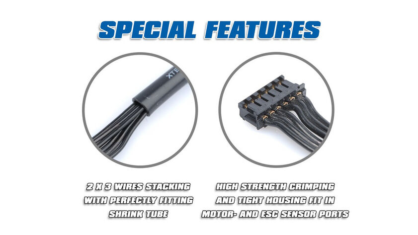 Nicely packaged 3 wire strands next to each other and stacked in 2 rows on top of each other, perfectly positioned with a shrink tube, which is not too tight and not too loose with further improved crimping and a tight fit to the motor- and ESC sensor ports.