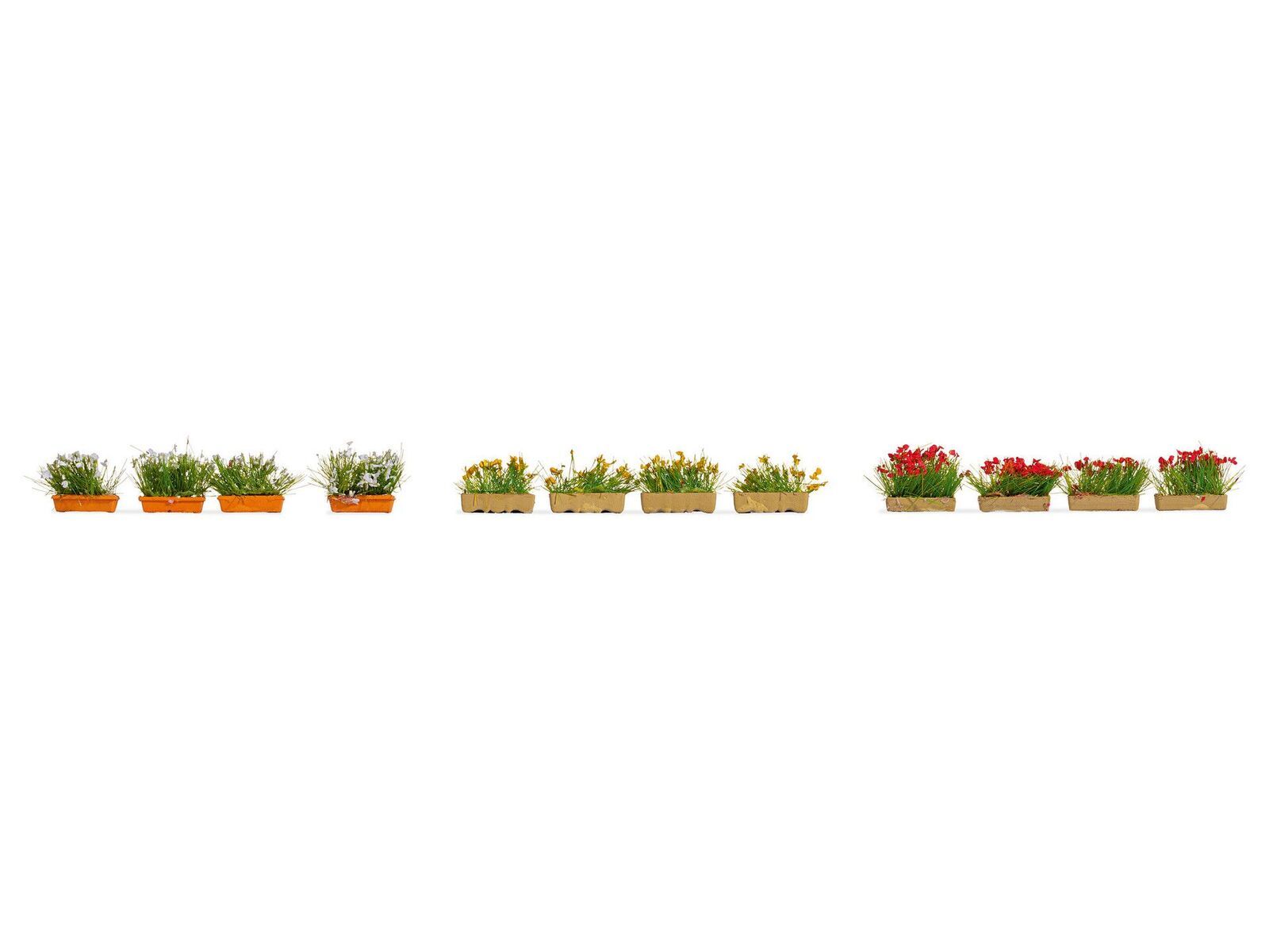 The “Flower Boxes, Blossoming” with blossoming plants make house façades and balconies more attractive. This set contains 12 flower boxes that you can use as decoration directly in the scene. The set is available in H0 gauge and is ideally suited to creating a landscape with even more decorations. Blossoming flowers’ cheerful colours really draw attention to a landscape and should not be missing. Whether it’s ornamental flowers, flowerpots, flowers or now the “Flower Boxes, Blossoming”, everyone has something to be amazed at when looking at the beautiful landscape.