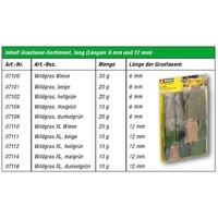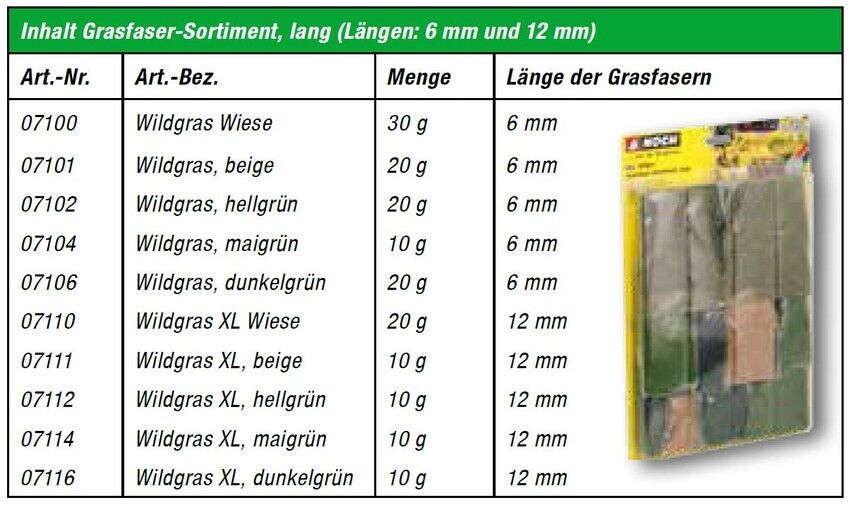 NOCH has compiled two Grass Fibre Assorments for professionals and for beginners. One does contain a compilation a short fibres in 1.5 mm and 2.5 mm length - ideal for greening landscapes on the H0, TT, N and Z scales. Another compilation contains fibres with 6 mm and 12 mm length. There are suited for the 1, 0 and H0 model scales.