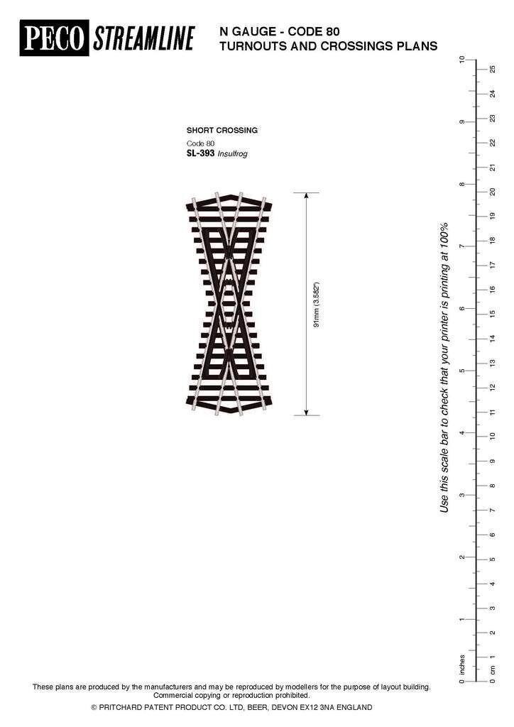 PECO STREAMLINE N CODE 80 CROSSING, SHORT A space saving design, ideal for goods yards etc. when used with Setrack Short Radius Turnouts ( ST-5 & ST-6 ). PECO Streamline N Gauge Code 80 - Universal trackage system This ever-popular trackage system for N offers a choice of either wooden or concrete type sleeper flexible track and a wide range of turnouts and crossings in both Insulfrog and Electrofrog types. Suitable for all makes of N Gauge trains and fully compatible with PECO Setrack. Technical Specification: Length: 91mm Frog Angle: 25 Degrees