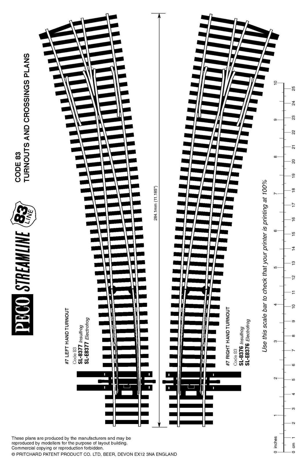 PECO STREAMLINE OO/HO CODE 83 CURVED TURNOUT, 7TH RADIUS, LEFT HAND 83 Line items are realistic models of North American railroad track, with Code 83 nickel silver rail. Scaled from A.R.E.A. drawings and NMRA compliant, Code 83 features authentic tie sizes and spacing, the standard American number system for frog geometry, plus a very fine representation of traditional rail spike fixings. Technical Specification: Length: 223.5mm Frog Angle: 9.5 Degrees Radius: 1092mm
