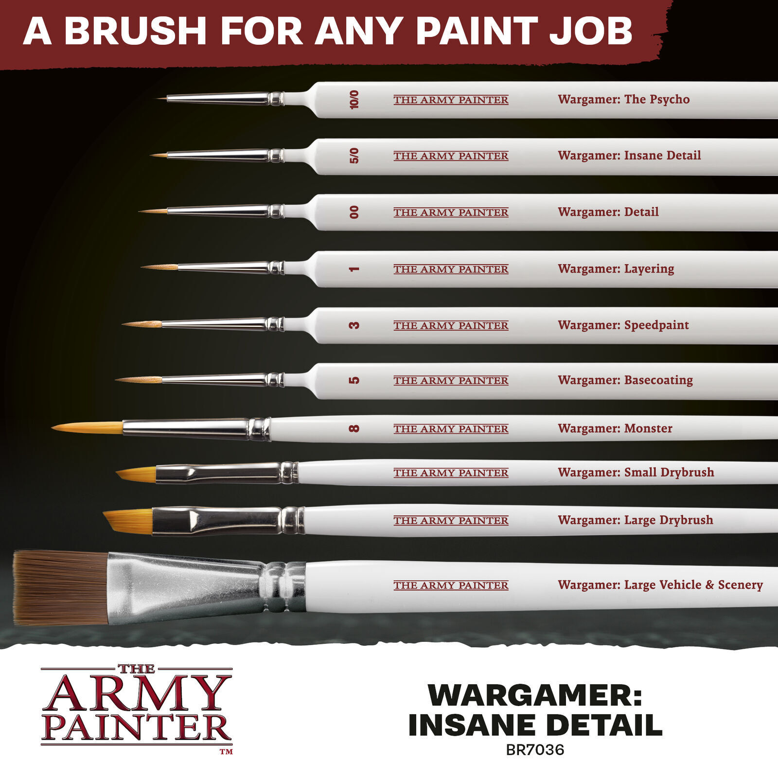 Designed with an ultra-fine tip for pinpoint accuracy, the Size 5/0 Insane Detail brush with Bionic Bristles is ideal for precision work such as weapons, monster scales, and rivets. Add our historically bestselling brush to your arsenal.