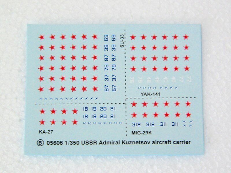More Features : Either waterline version or full hull version can be selected; Include 3 Su-27K, 3 MiG-29K, 4 Yak-41M Freestyle, 4 Ka-27, total 4 types 14 aircraft with clear canopy, folding wings, especially with clear fuselage and folding rotor on the helicopter.