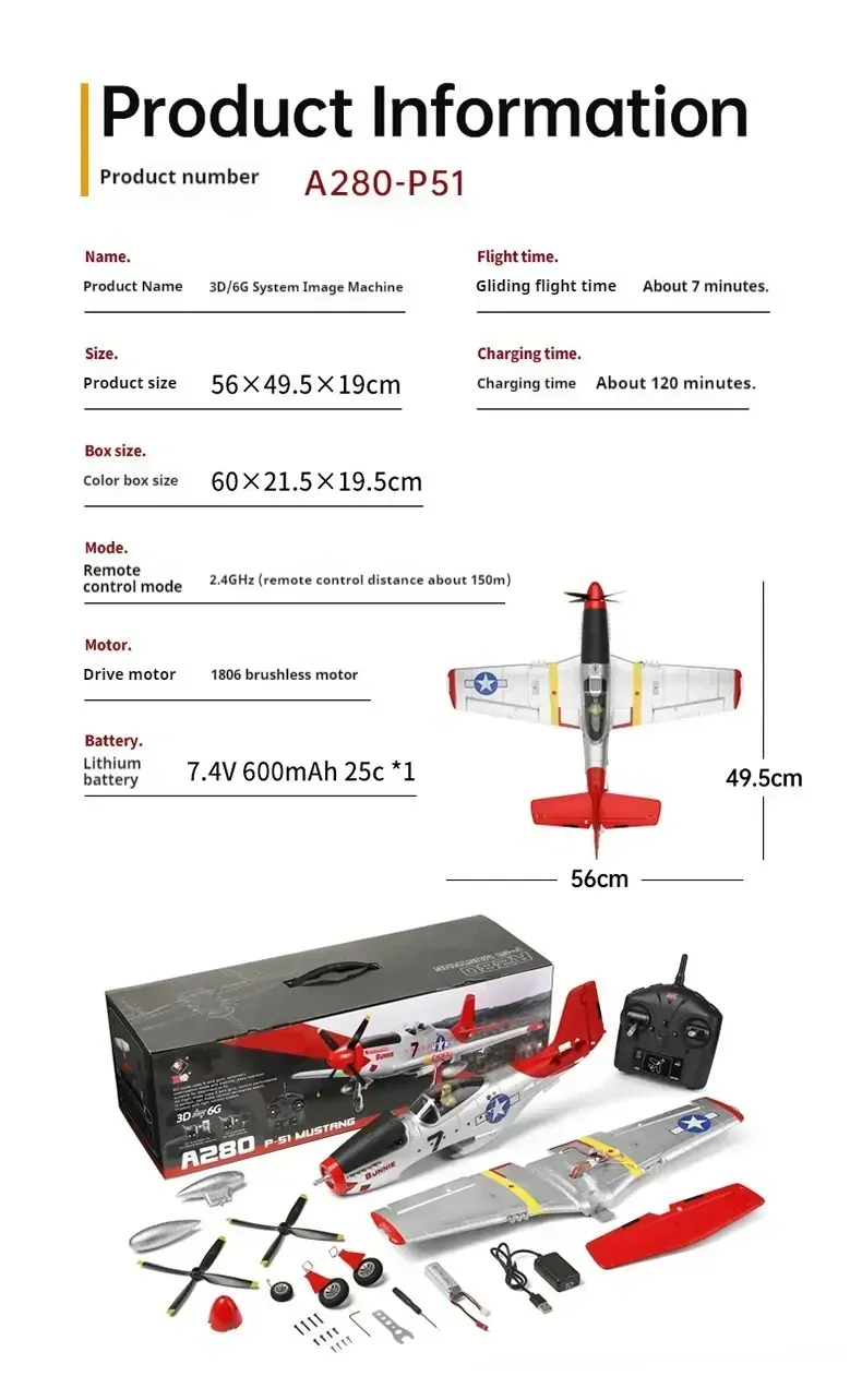 Adopt impact resistant EPP+engineering materials, P-51 Mustang Fighter high simulation. The rack adopts a quick installation and replacement structure, which is easy to carry.
